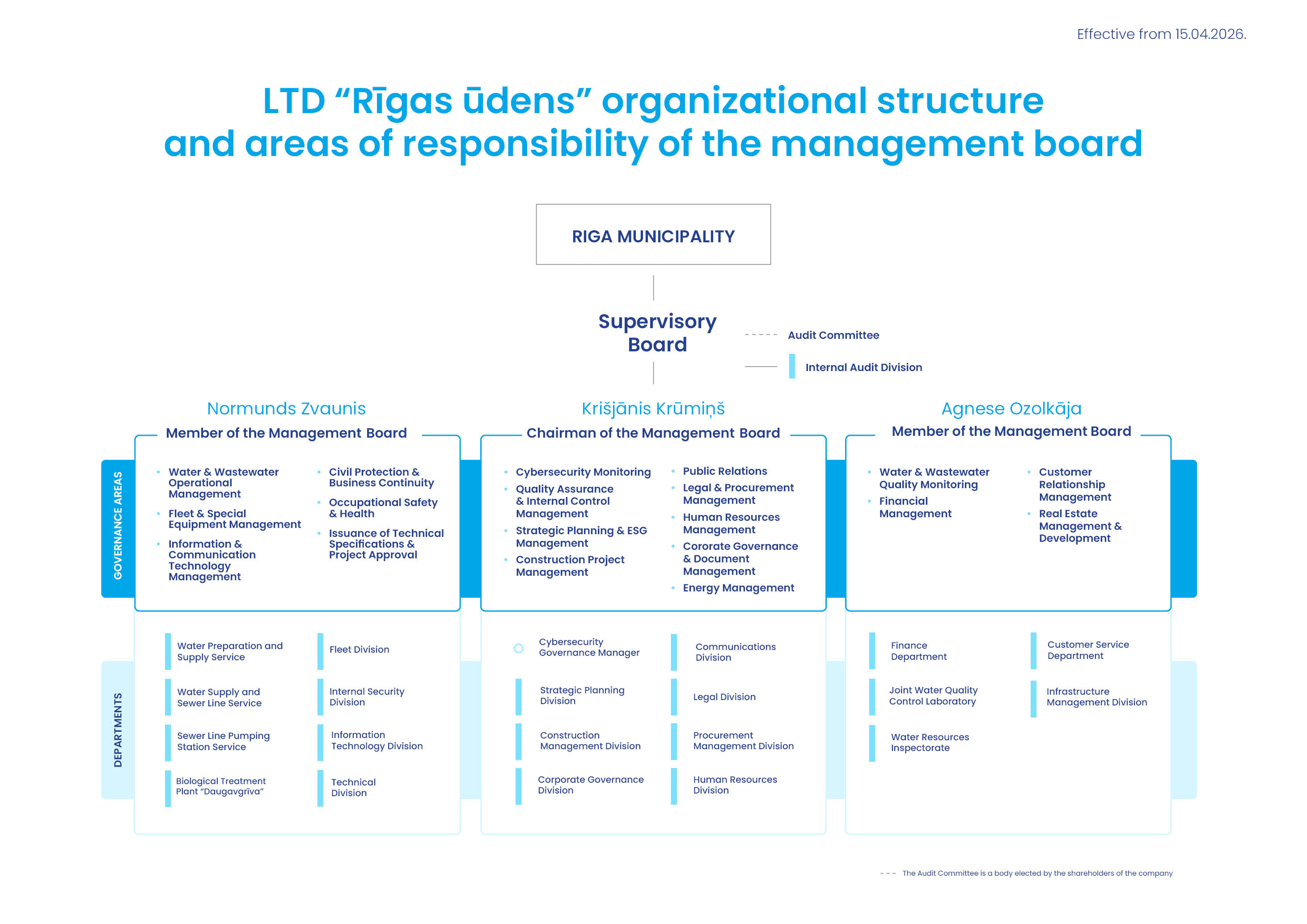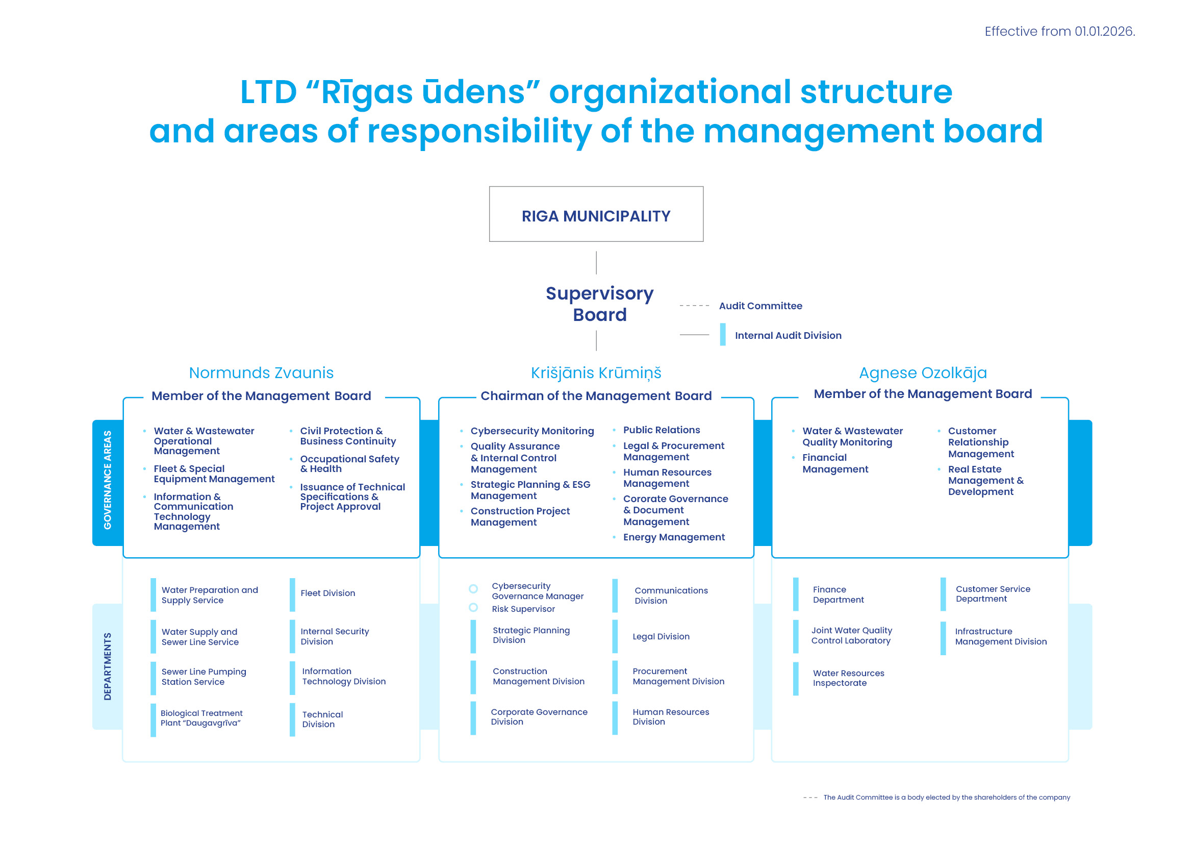 The Management Board of LLC "Rīgas ūdens" consists of three members who ensure the company's operations and development. The board is responsible for the company's day-to-day management, financial oversight, and accounting, in compliance with the Articles of Association, board regulations, and legal requirements. It supervises the use of the company's resources and ensures compliance with established standards and shareholder meeting decisions. The Management Board operates based on the principles set out in the Articles of Association and its own Regulations, in line with applicable laws. The board collectively represents the company, and its members may authorize one or more of their peers to handle specific transactions or types of transactions.