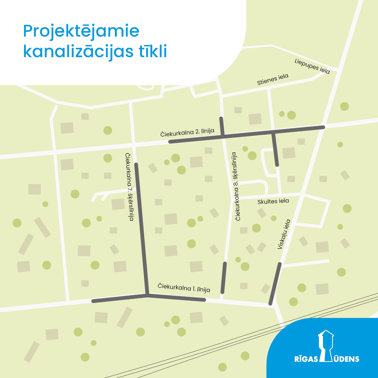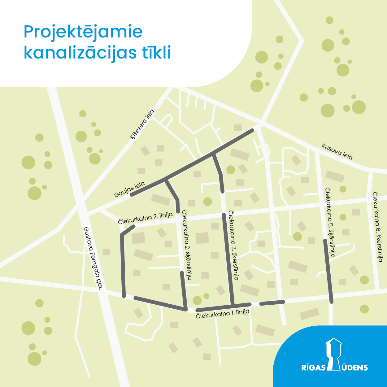 Čiekurkalna ūdensapgādes un kanalizācijas tīklu paplašināšanas 1. kārtas būvprojekta izstrāde tika uzsākta jau 2024. gada nogalē. Šis kārtas ietvaros plānota kanalizācijas tīklu paplašināšana Čiekurkalna 1. līnijas posmā no 1. šķērslīnijas līdz 5. šķērslīnijai, kā arī 1., 2, 3. un 5. šķērslīnijā, tāpat arī 7. šķērslīnijas posmā no Čiekurkalna 2. līnijas līdz Stienes ielai. Kopumā plānots izbūvēt pašteces kanalizāciju 2260 m garumā un kanalizācijas spiedvadu 61 m garumā. Šajos posmos plānota arī ūdensvadu atjaunošana kopumā 2255 m garumā. Būvniecību plānots sākt 2026. gadā un pabeigt 2027. gadā. Tas ļaus pilsētas tīkliem pievienot aptuveni 130 nekustamos īpašumus.
