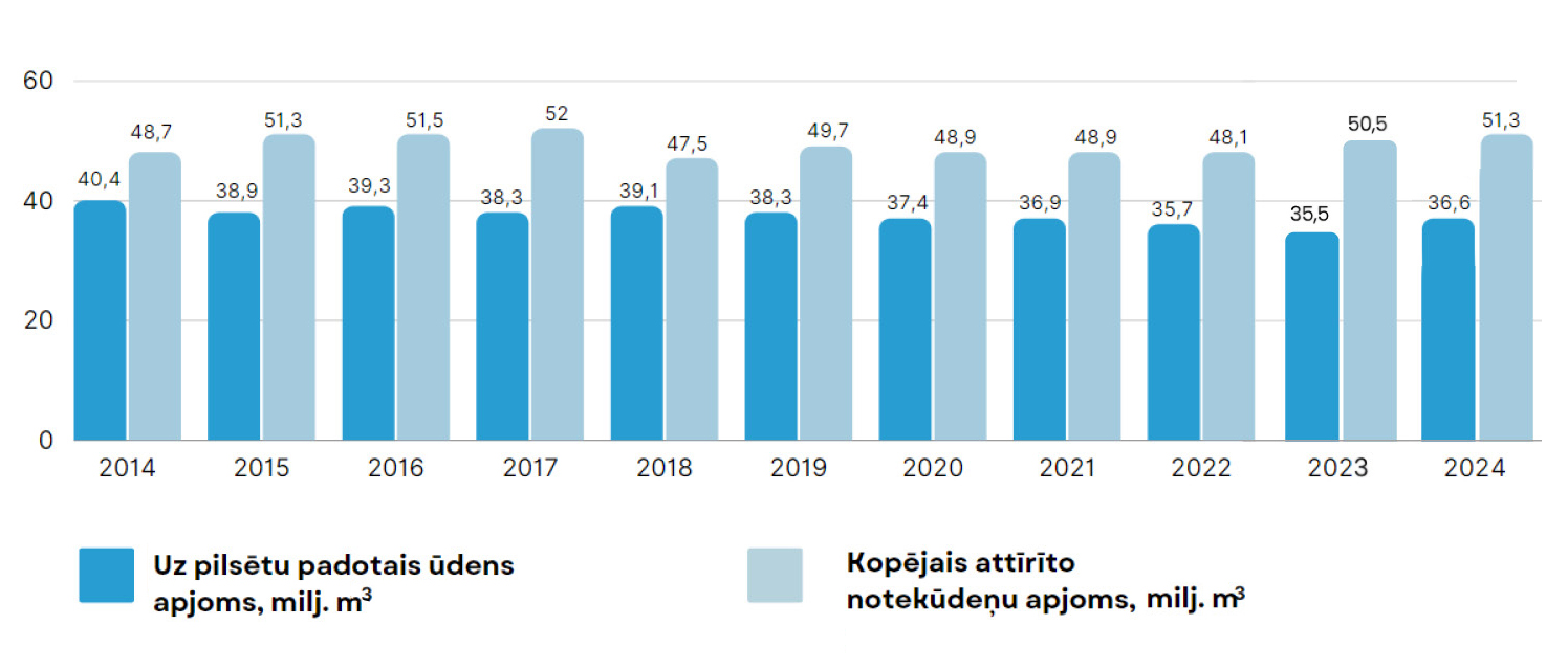 2024. gadā Rīgas pilsētas ūdensvada tīklā kopumā tika padoti 36,6 milj. m3 ūdens, ūdensapgādes pakalpojumu realizācijas apjoms 2024. gadā sasniedza 31,5 milj. m3. Bioloģiskās attīrīšanas stacijā “Daugavgrīva” 2024. gadā kopumā tika attīrīti 51,3 milj. m3 notekūdeņu.
