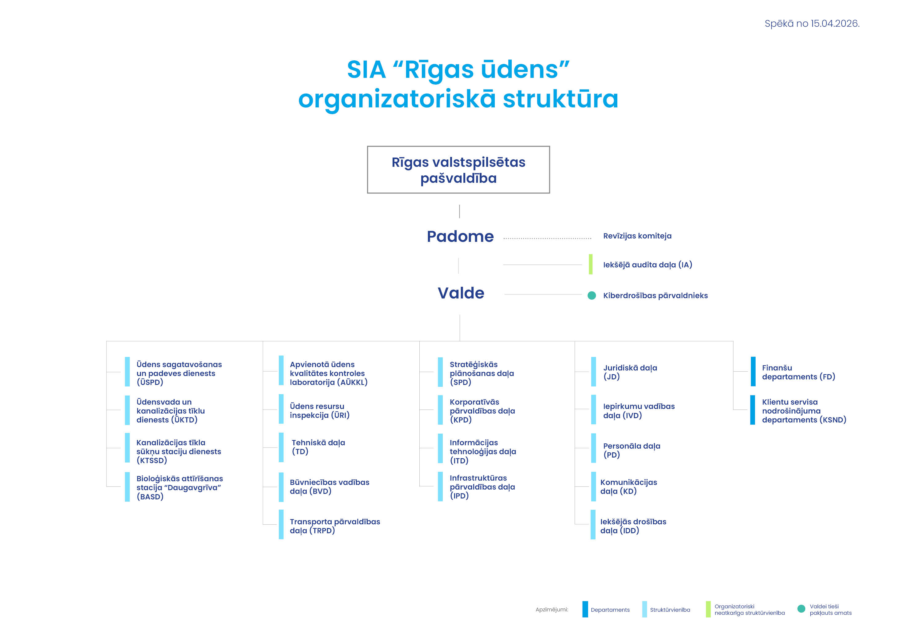 Uz 2026. gada 1. janvāri SIA "Rīgas ūdens" 21 struktūrvienībā strādāja 750 darbinieki, no kuriem 76,2% veido ražošanas personāls, 15,1% strādājošo ir iesaistīti administratīvos, bet 8,7% - ar pakalpojumu pārdošanu saistītos procesos.