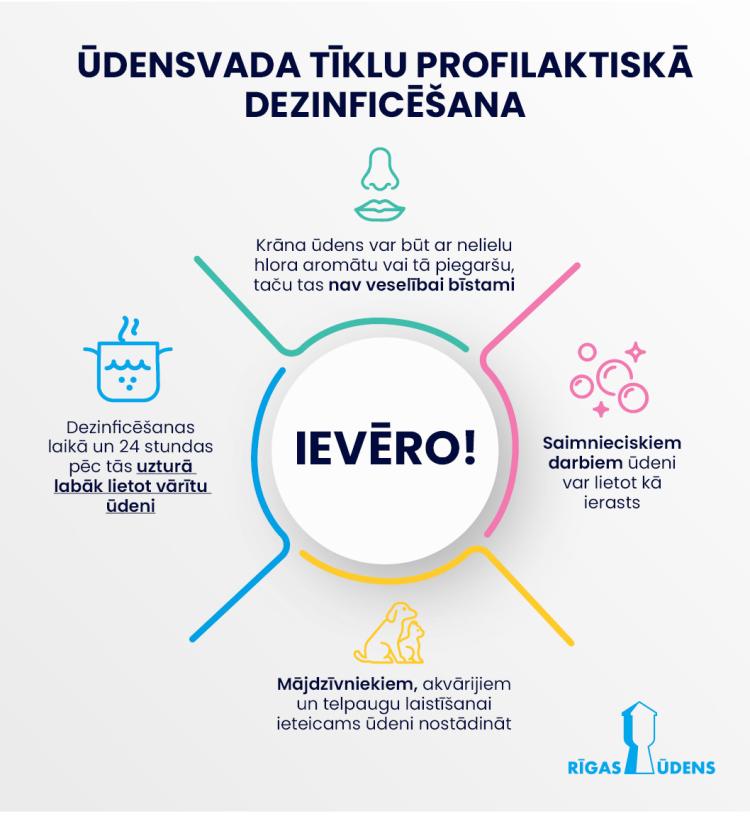 Ūdensvadu dezinficēšanas laikā krāna ūdens iegūst nepatīkamu aromātu, un tam var būt arī neliela hlora piegarša, taču šī viela dezinfekcijas nolūkos izmantojamajos daudzumos nav veselībai kaitīga vai bīstama. “Rīgas ūdens” situāciju nepārtraukti monitorēs, rūpīgi sekojot hlora koncentrācijai ūdenī.