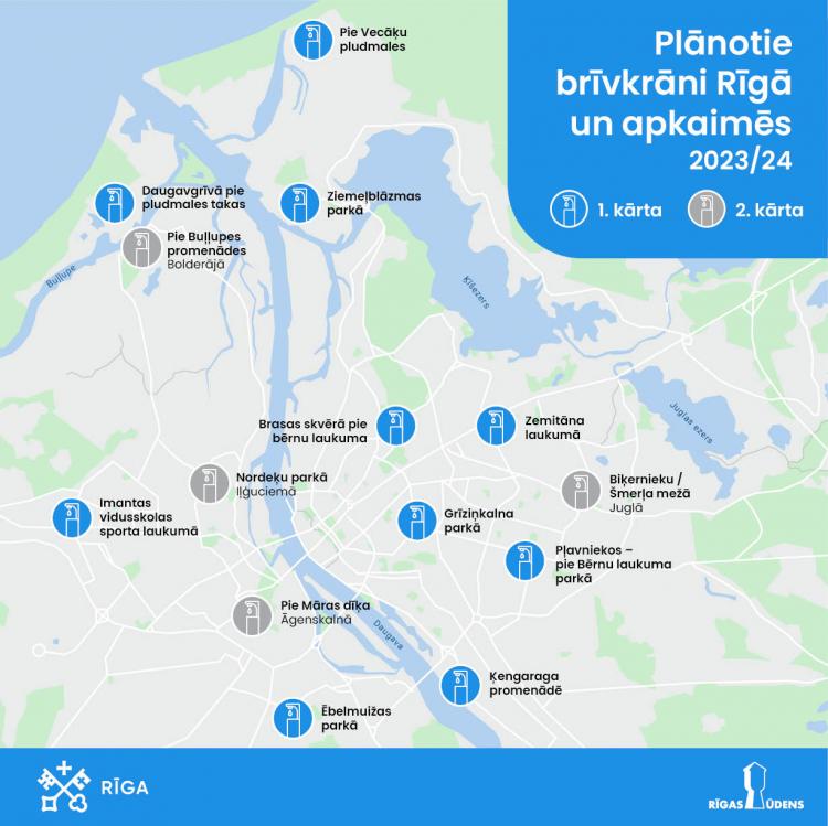 Jau šogad Rīgā plānots ierīkot desmit jaunus brīvkrānus: Brasas skvērā, Grīziņkalna parkā, Ziemeļblāzmas parkā, Ēbelmuižas parkā, pie bērnu laukuma parkā Pļavniekos, Ķengaraga promenādē, Zemitāna laukumā, pie Vecāķu pludmales, pie pludmales takas Daugavgrīvā, kā arī Imantas vidusskolas sporta laukumā. 2024. gadā plānots ierīkot brīvkrānus arī pie Māras dīķa, Nordeķu parkā, pie Buļļupes promenādes un Biķernieku / Šmerļa mežā. Šīs vietas izvēlētas, apkopojot pērn Apkaimju iedzīvotāju centra veiktās aptaujas datus.