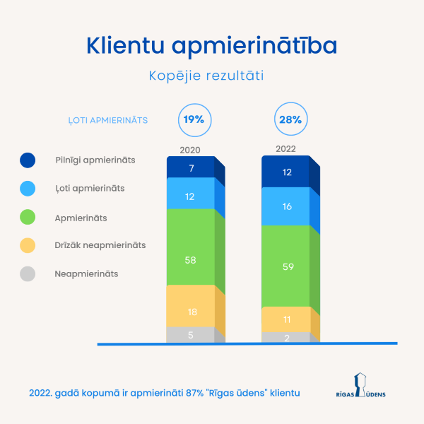 Kopš 2020. gada ir būtiski pieaugusi klientu apmierinātība ar SIA “Rīgas ūdens” un tās sniegtajiem pakalpojumiem. 2022. gadā sadarbību ar SIA “Rīgas ūdens” par kopumā apmierinošu atzinusi lielākā daļa jeb 87% respondentu (2020. gadā – 77%), secināts SIA “RAIT Custom Research Baltic” veiktajā klientu apmierinātības pētījumā.
