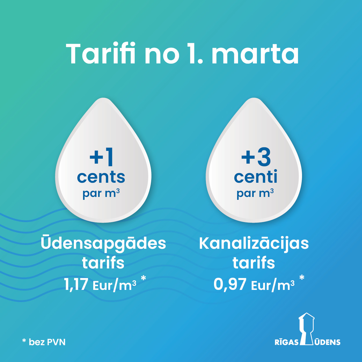 Par ūdensapgādes pakalpojumiem no 1. marta būs jāmaksā 1,17 eiro par kubikmetru (bez PVN), bet par kanalizācijas pakalpojumiem – 0,97 eiro par kubikmetru (bez PVN) apmērā. Šobrīd spēkā esošais tarifs ir attiecīgi ir 1,16 eiro ūdensapgādei un 0,94 eiro kanalizācijai par kubikmetru (bez PVN).